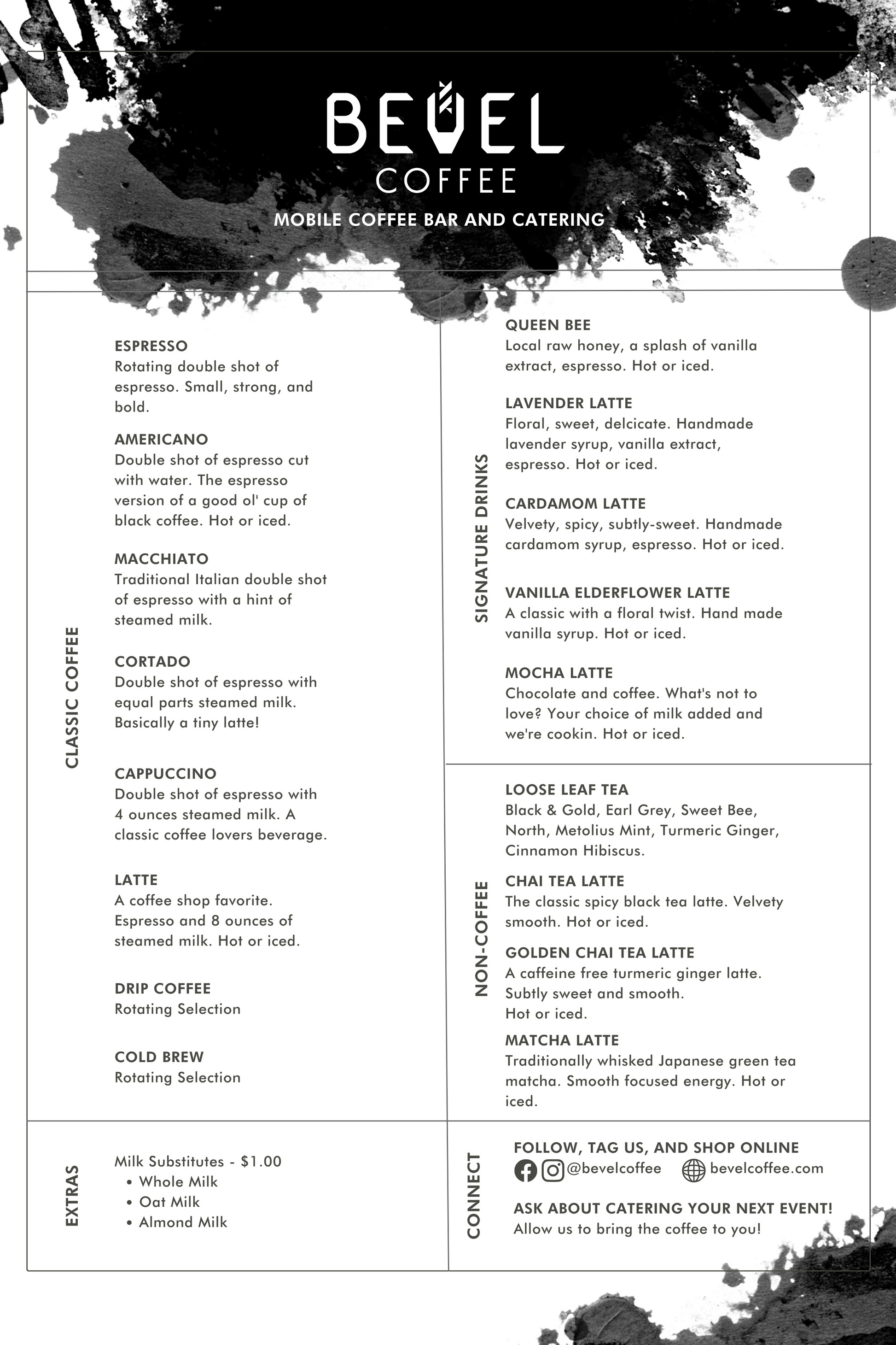 Bring the Bevel Coffee Cart to your private event! Your service will include 3 hours of service with a barista, a full coffee menu with lattes, espresso, signature beverages and more, a tea menu with chais, matchas, and loose leaf teas, all the cups, sugars, milk alternatives, and accouterments, and of course, a smile!